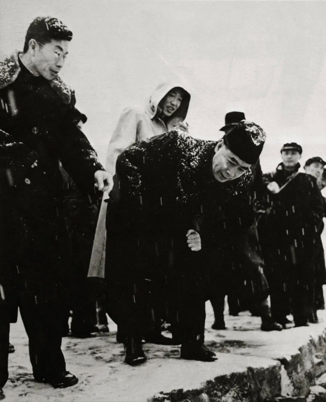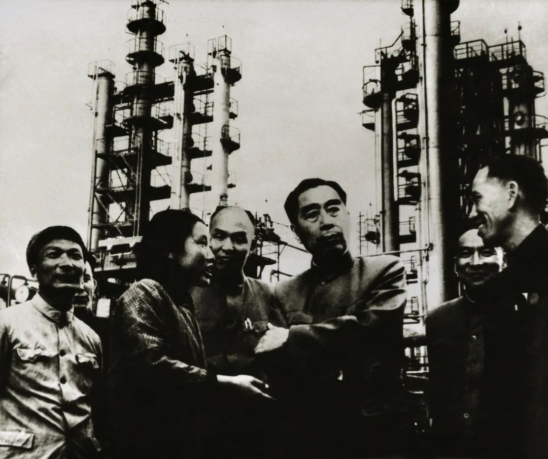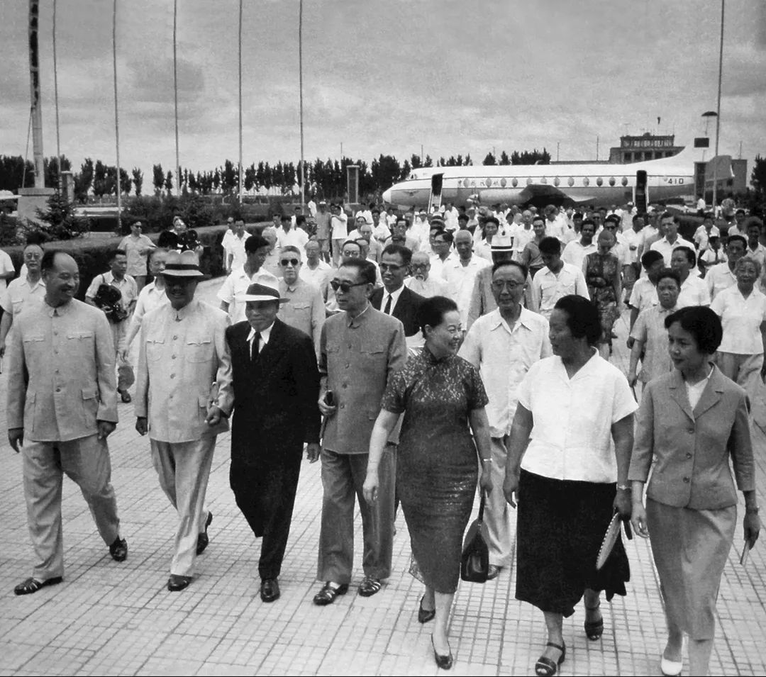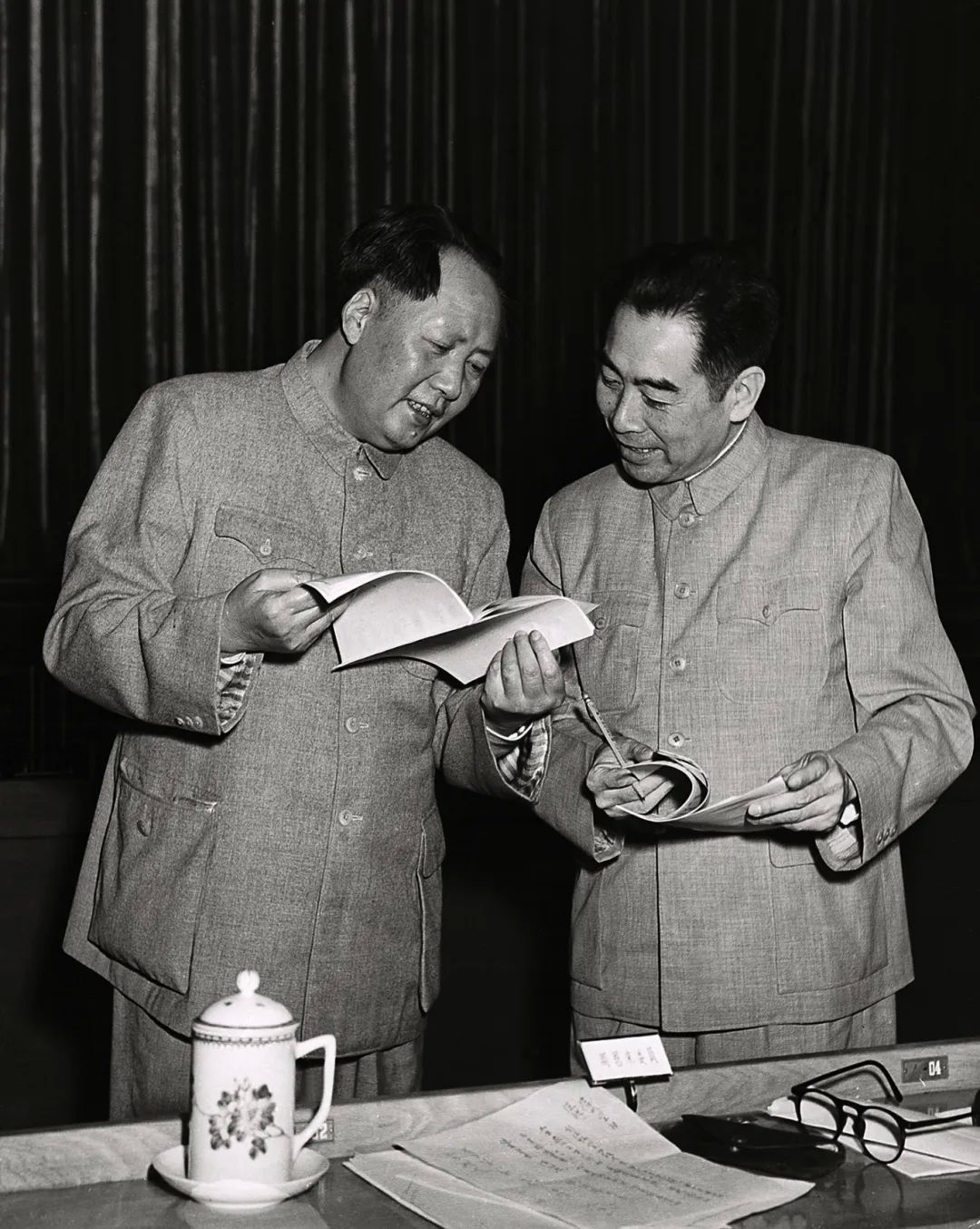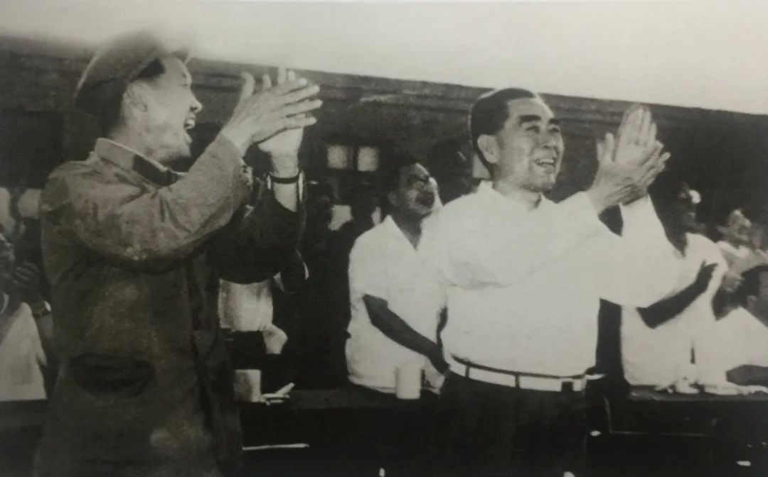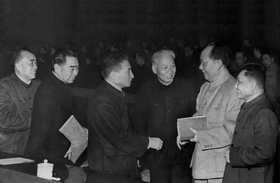 1962年1月11日至2月7日,中共中央在北京召开扩大工作会议,图为周恩来和毛泽东、刘少奇、朱德、邓小平、陈云在七千人大会上
