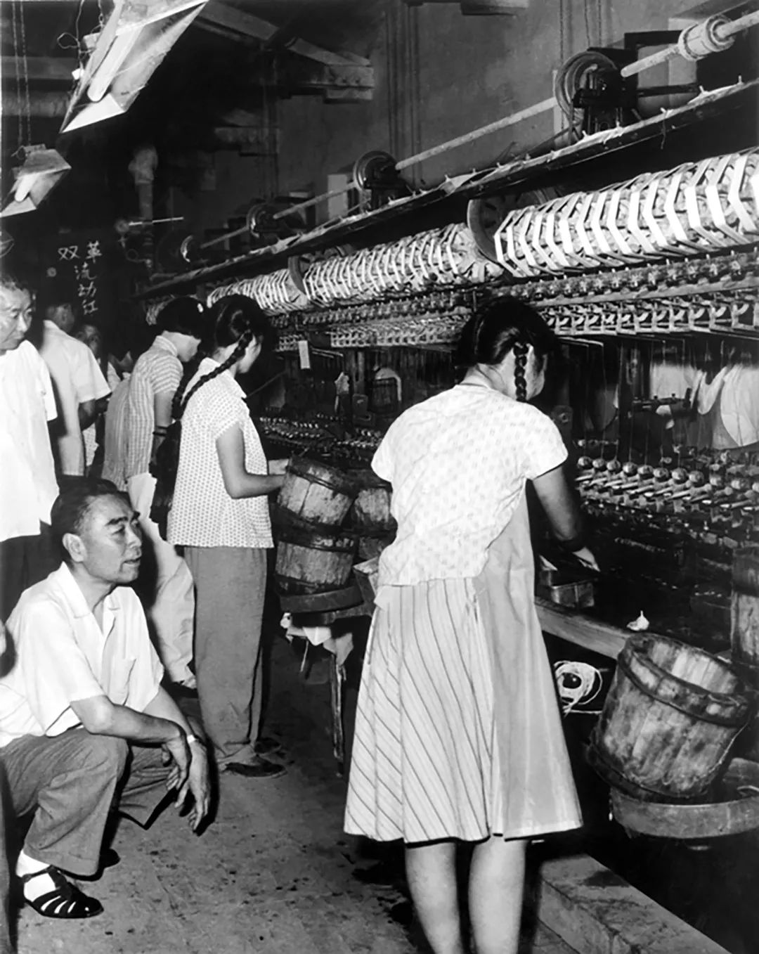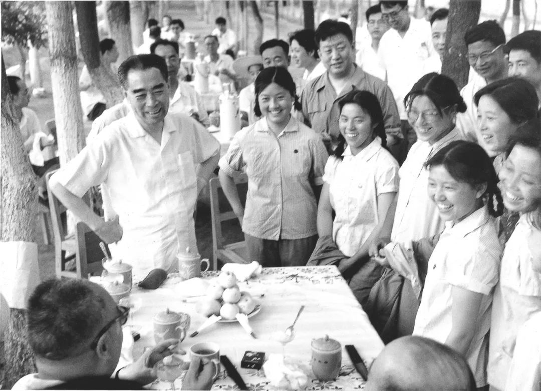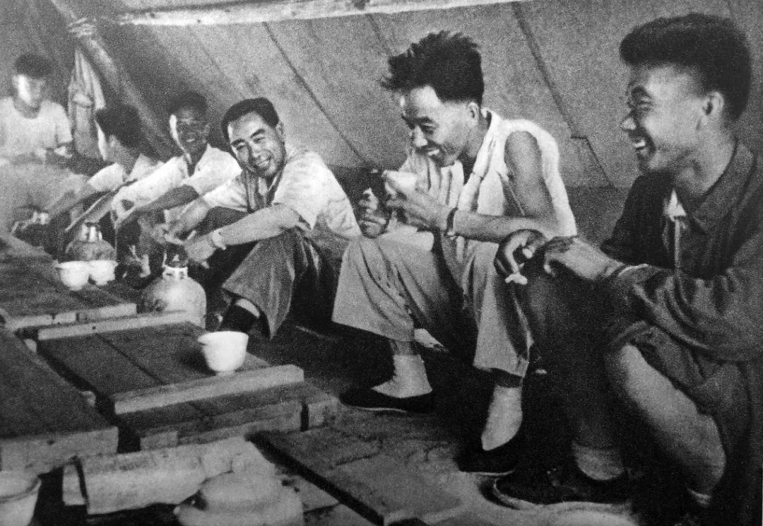 1958年,周恩来视察怀柔水库时在工棚里与干部亲切交谈