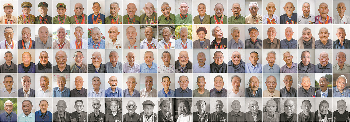 摄影作品《百名跨过鸭绿江的黄山籍志愿军老战士》(最后一排黑白照片为近年离世的老兵)。倪国初 摄制