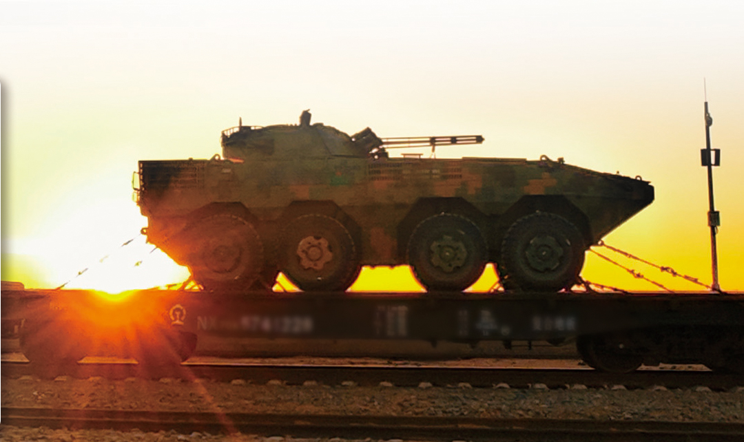 在某火车站应急军事运输投送装载训练现场,铁路货运员陈建民一边警惕留意周围动静,一边加固火车上的军用装备物资。