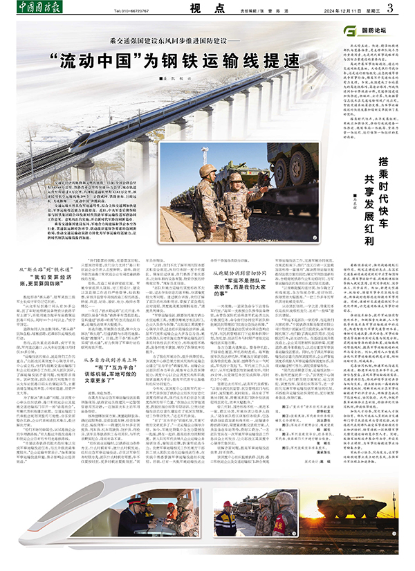 乘着交通强国建设东风,军地合力构建辐射铁公水空各行业、贯通装运卸转各环节、联动战训建保各要素的协同新格局,推动交通运输动员潜力转化为军事运输投送能力,让新时代钢铁运输线提挡加速。