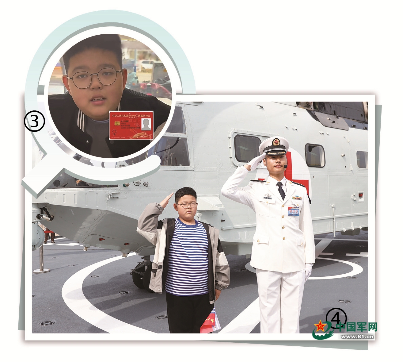 图④:毛豆参观海军舰艇,与舰上官兵一起敬礼。刘再耀摄