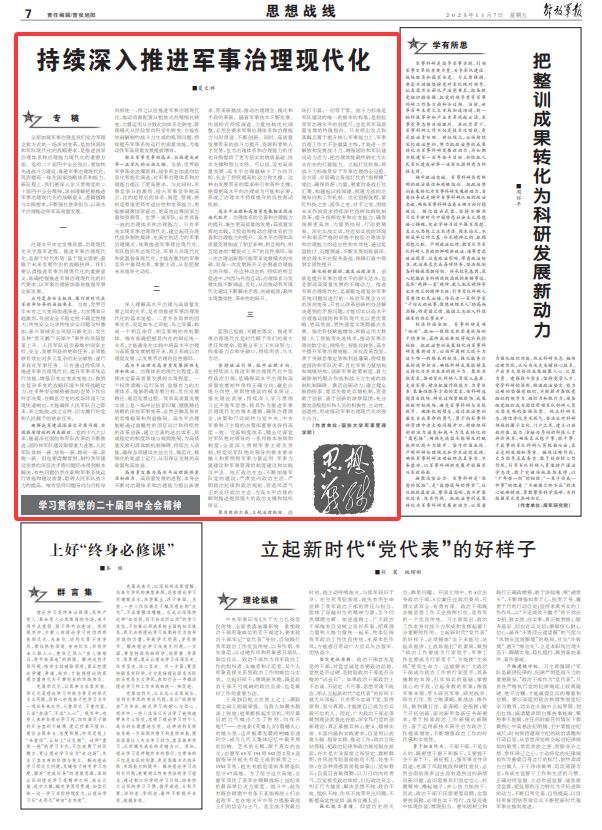 全面加强军事治理是我们党治军理念和方式的一场深刻变革,是加快国防和军队现代化的战略要求,是推进国家治理体系和治理能力现代化的重要方面。党的二十届四中全会指出,要加快先进战斗力建设,推进军事治理现代化,巩固提高一体化国家战略体系和能力。新征程上,我们要深入学习贯彻党的二十届四中全会精神,深刻理解把握推进军事治理现代化的战略意义、逻辑链路与实践要求,不断强化使命担当,以高水平治理推动我军高质量发展。