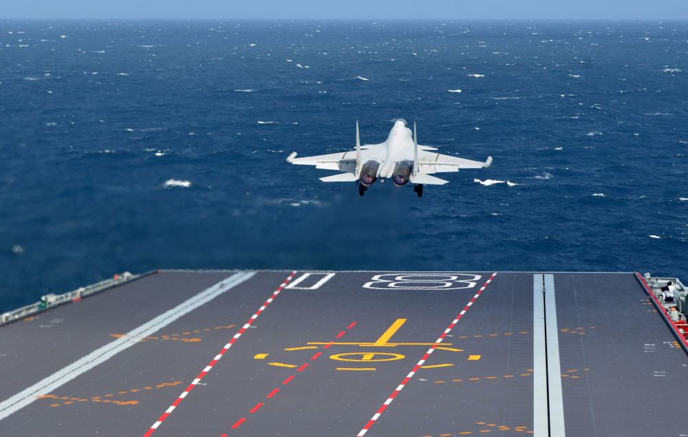 海军福建舰开展入列后首次海上实兵训练期间,歼-15DT舰载机弹射起飞。新华社发
