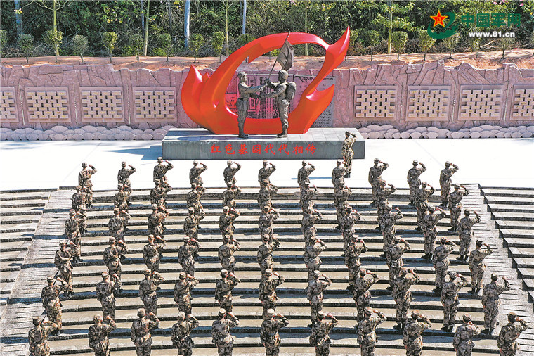 近日,第73集团军某旅组织官兵在旅英烈广场开展红色基因传承教育。图为官兵面朝英烈雕像,重温入伍誓词。赖 坤摄
