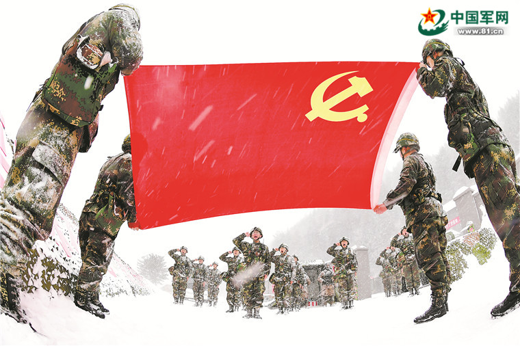 在严寒条件下进行实兵对抗演练的火箭军某部开展战地动员,组织向党旗宣誓活动。赵吉垒摄