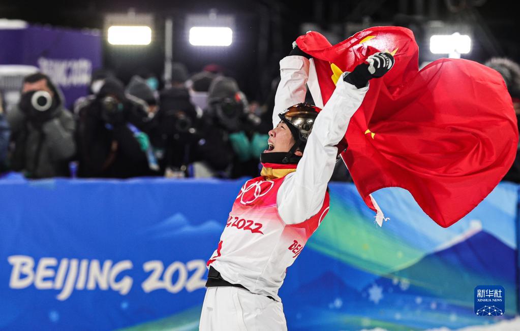 图为中国选手徐梦桃在北京2022年冬奥会自由式滑雪女子空中技巧决赛后庆祝(2022年2月14日)。新华社记者 吴壮 摄