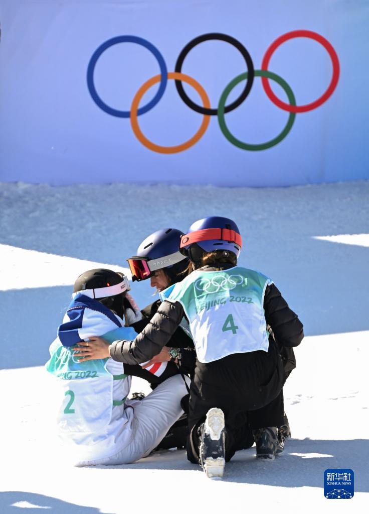 图为在北京2022年冬奥会自由式滑雪女子大跳台决赛后,中国选手谷爱凌(右)和瑞士选手玛蒂尔德·格雷莫德(中)安慰法国选手苔丝·勒德(2022年2月8日摄)。新华社记者 武巍 摄