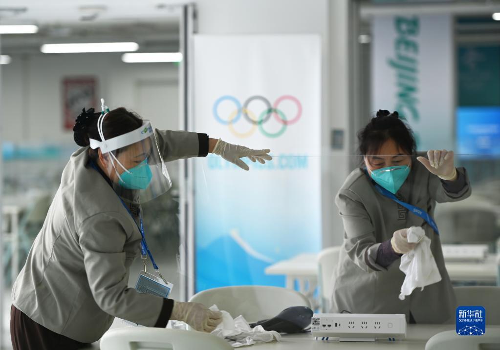 图为工作人员在北京国家速滑馆“冰丝带”的媒体工作区域消毒(2022年1月28日摄)。新华社记者 武巍 摄