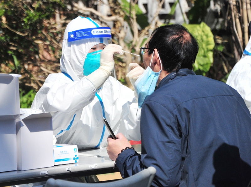 2022年3月7日,上海,社区内,医护人员给市民做核酸检测采样。