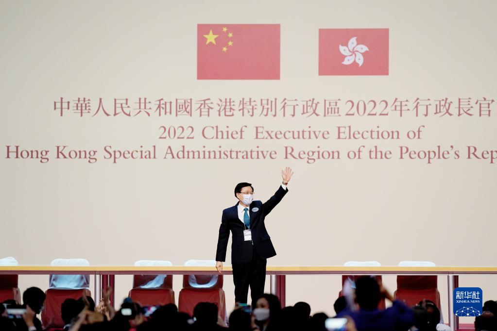 在当天举行的香港特别行政区第六任行政长官选举中,李家超高票当选第六任行政长官人选。这是完善香港选举制度后的首次行政长官选举,是有香港特色民主的又一次重要成功实践。