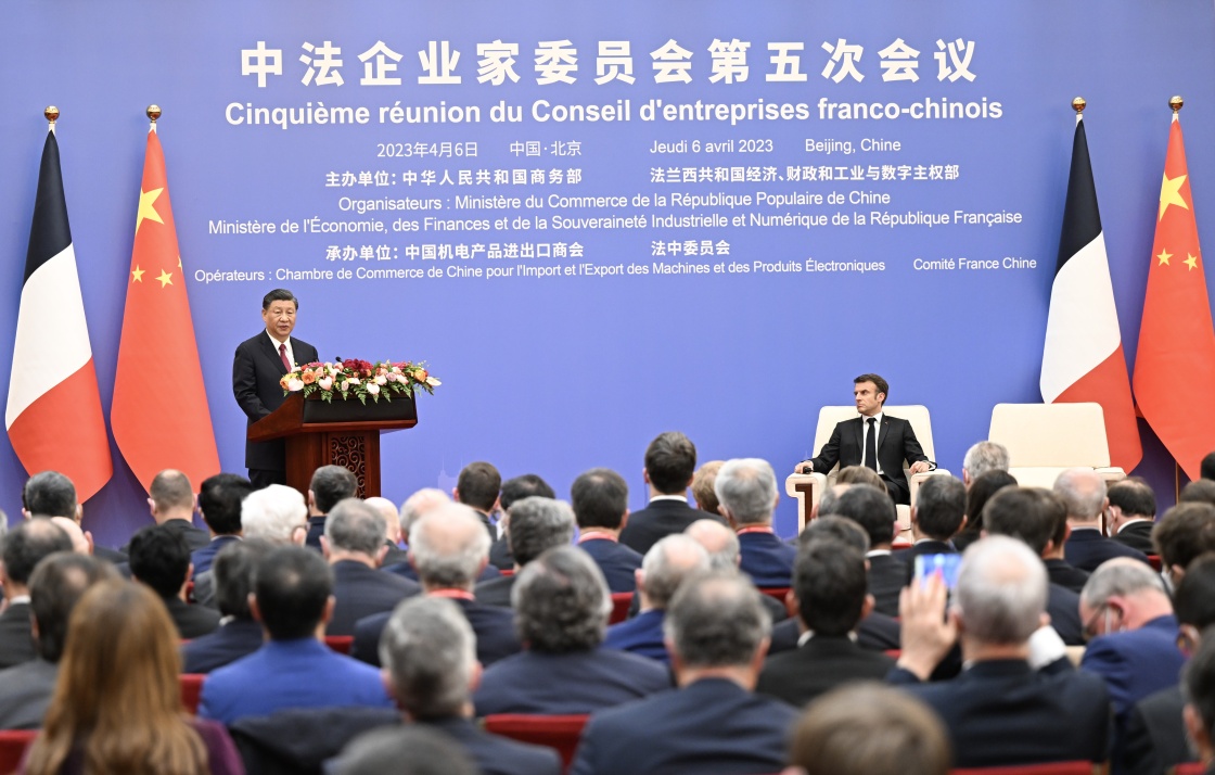 4月6日下午,国家主席习近平在北京同法国总统马克龙共同出席中法企业家委员会第五次会议闭幕式并致辞。新华社记者 谢环驰 摄