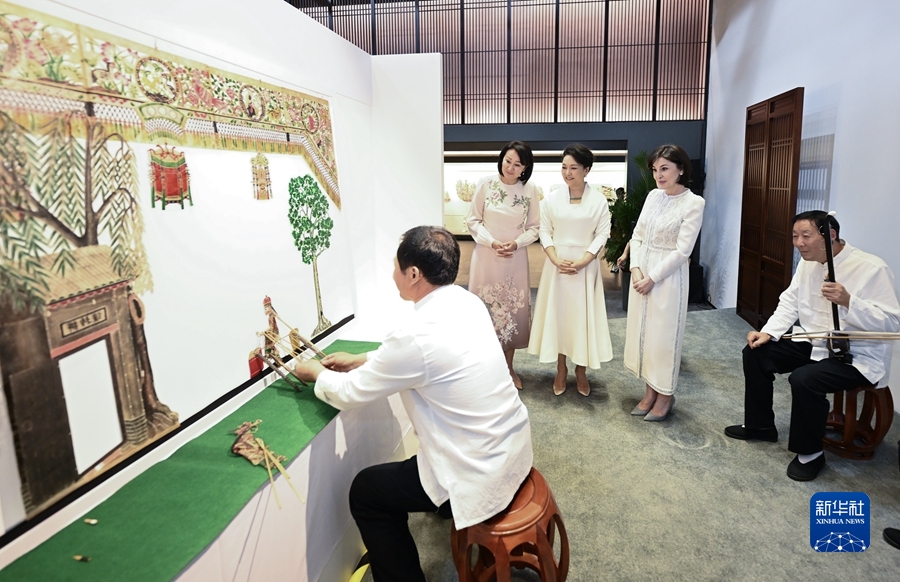 5月19日上午,国家主席习近平夫人彭丽媛邀请出席中国-中亚峰会的吉尔吉斯斯坦总统夫人扎帕罗娃、乌兹别克斯坦总统夫人米尔济约耶娃共同参观西安易俗社。这是在易俗社展示厅,彭丽媛同来宾们体验皮影制作技艺。新华社记者 丁林 摄