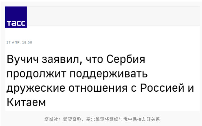 据俄新社报道,当地时间4月17日,塞尔维亚总统武契奇在会见俄罗斯驻塞尔维亚大使哈尔琴科时称,在融入欧洲的道路上,塞尔维亚将继续与俄罗斯和中国保持传统友好伙伴关系。
