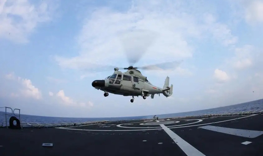 解放军舰载直升机“超低空”巡航台岛东“监视”台军演训。(图片源自网络)