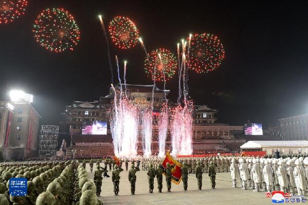 在随后举行的阅兵式上,包括战术导弹部队、坦克部队和防空火炮部队等各军兵种的方阵高呼口号,迈着整齐的步伐列队走过广场,接受金正恩等朝鲜领导人的检阅。阅兵式结束前,一批无人机腾空而起,在广场上空施放的焰火照亮了夜空。