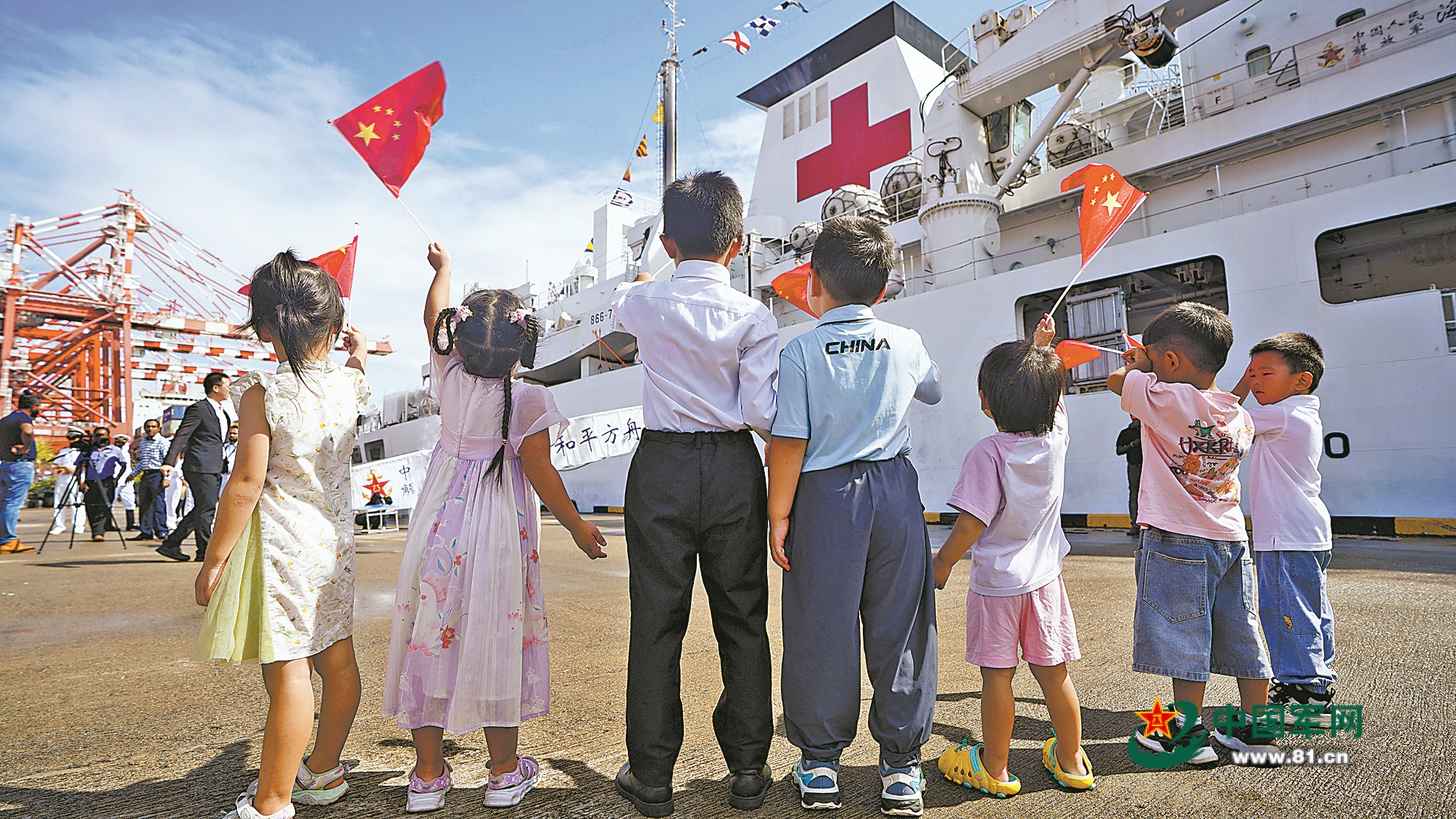 抵港当天,斯方在码头举行了欢迎仪式。现场欢迎人群挥动两国国旗,热烈欢迎“和平方舟”再次到访。斯方代表和中国驻斯里兰卡大使馆工作人员、中资机构员工代表、华侨华人等在码头迎接。