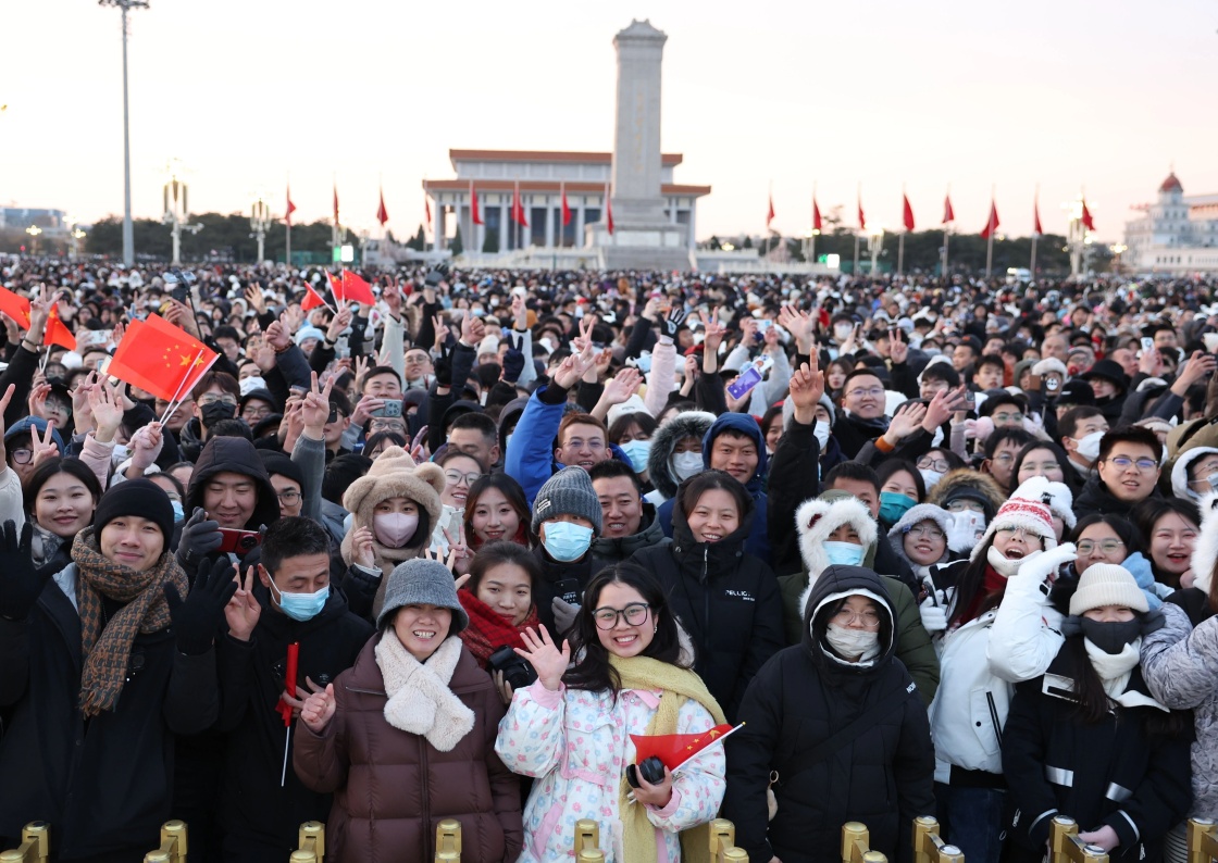 2025年1月1日清晨,北京天安门广场举行隆重的升国旗仪式。这是观众在升旗仪式结束后欢呼。