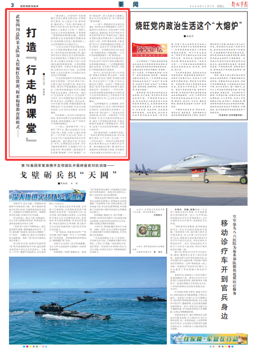 “红色资源是新时代思想政治教育的宝贵财富。”该支队领导介绍,巴蜀大地红色资源丰富,革命历史厚重,拥有红军强渡嘉陵江战役遗址、川陕革命根据地红军烈士陵园等著名红色遗址、革命旧址。他们以“红色故事、红色打卡、红色创演”为牵引,充分挖掘驻地红色资源,按照“体系设计、系统整合、深化运用、分步实施”的思路,积极构建富有地域特色的“行走的课堂”红色文化教育矩阵,让官兵时时受教育、处处受感染。