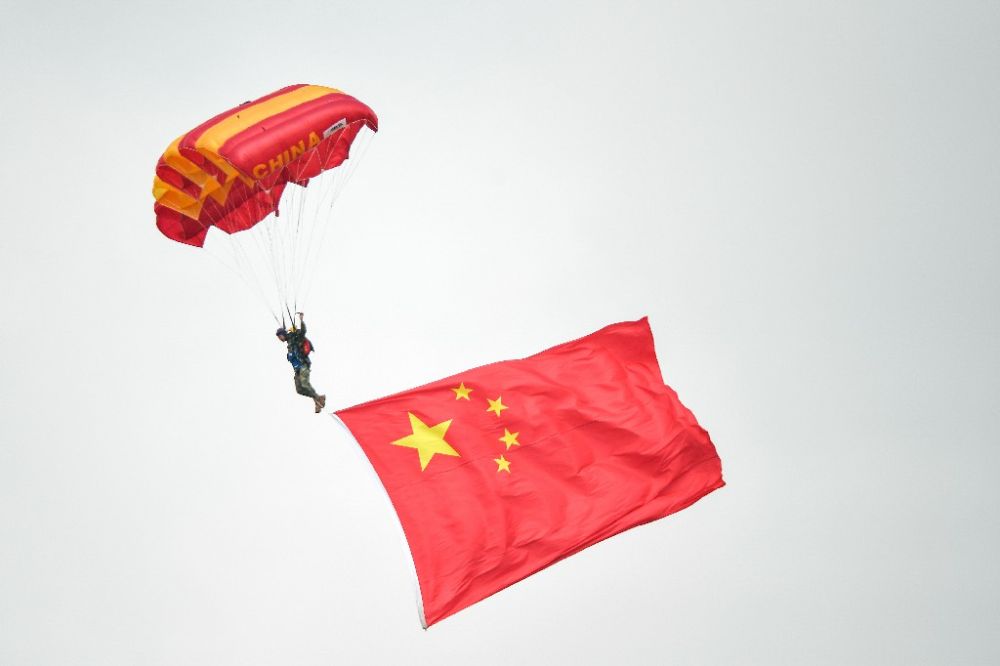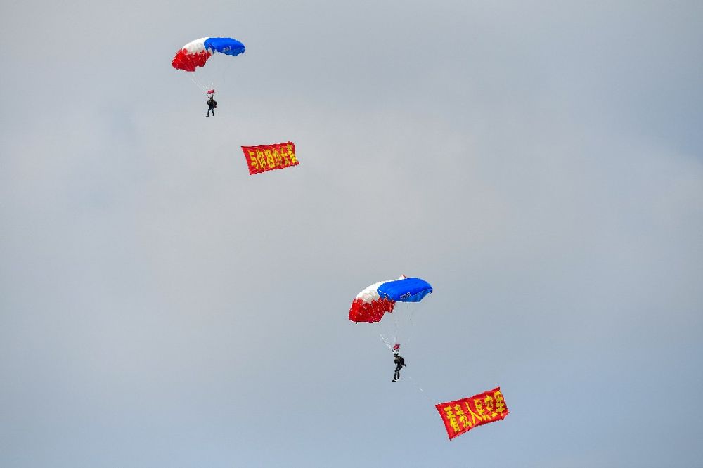 上午9时许,“八一”跳伞队队员携党旗、国旗、八一军旗和空军军旗从飞机上一跃而下,拉开飞行表演的序幕。随后,空军航空大学“蓝鹰”跳伞表演队队员携多幅标语迎风而下,昭示空军官兵矢志强军、逐梦空天的凌云壮志。