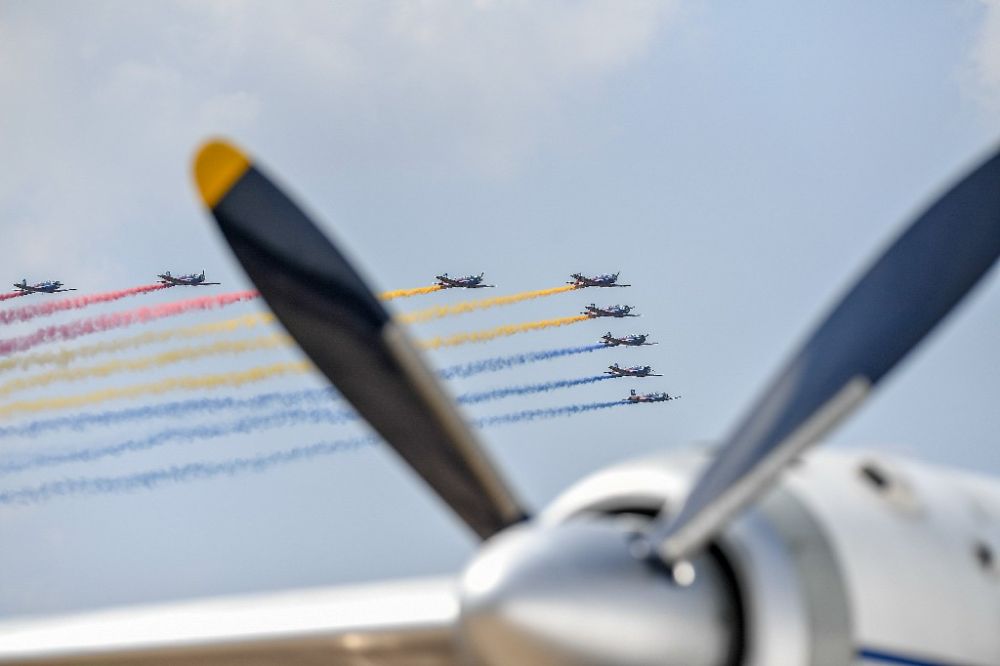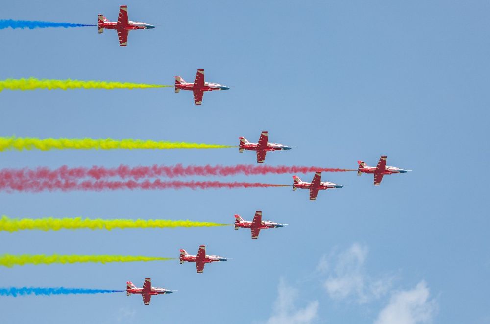 2023年空军航空开放活动·长春航空展26日在长春开幕,多支飞行、跳伞表演队共舞长空,空军以独特空中礼仪欢迎新飞行学员加入“蓝天方阵”,吸引更多有志青年为守护祖国蓝天奉献青春力量,并向抗美援朝战争胜利70周年致敬。