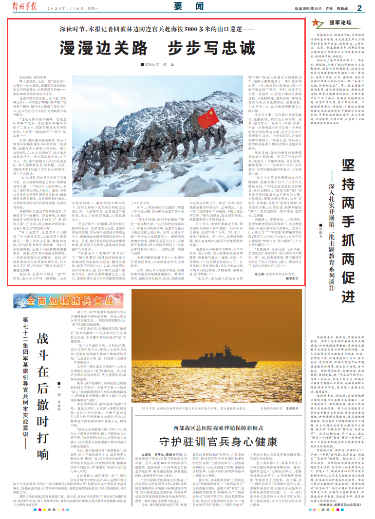 戍边无小事。这件事让他深受触动,也感到肩上的责任沉甸甸的。后来,他与官兵一起学习、训练、执勤,不止一次看到战士们为完善一个具体的战术动作精益求精,甚至在讨论中争得面红耳赤。“中途休息时,大家还在聊训练技巧。”杨连长说,官兵身上强烈的战备意识和戍边情怀让他深受感染。