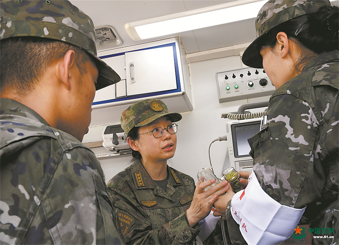 医务人员指导官兵使用便携式医疗设备。