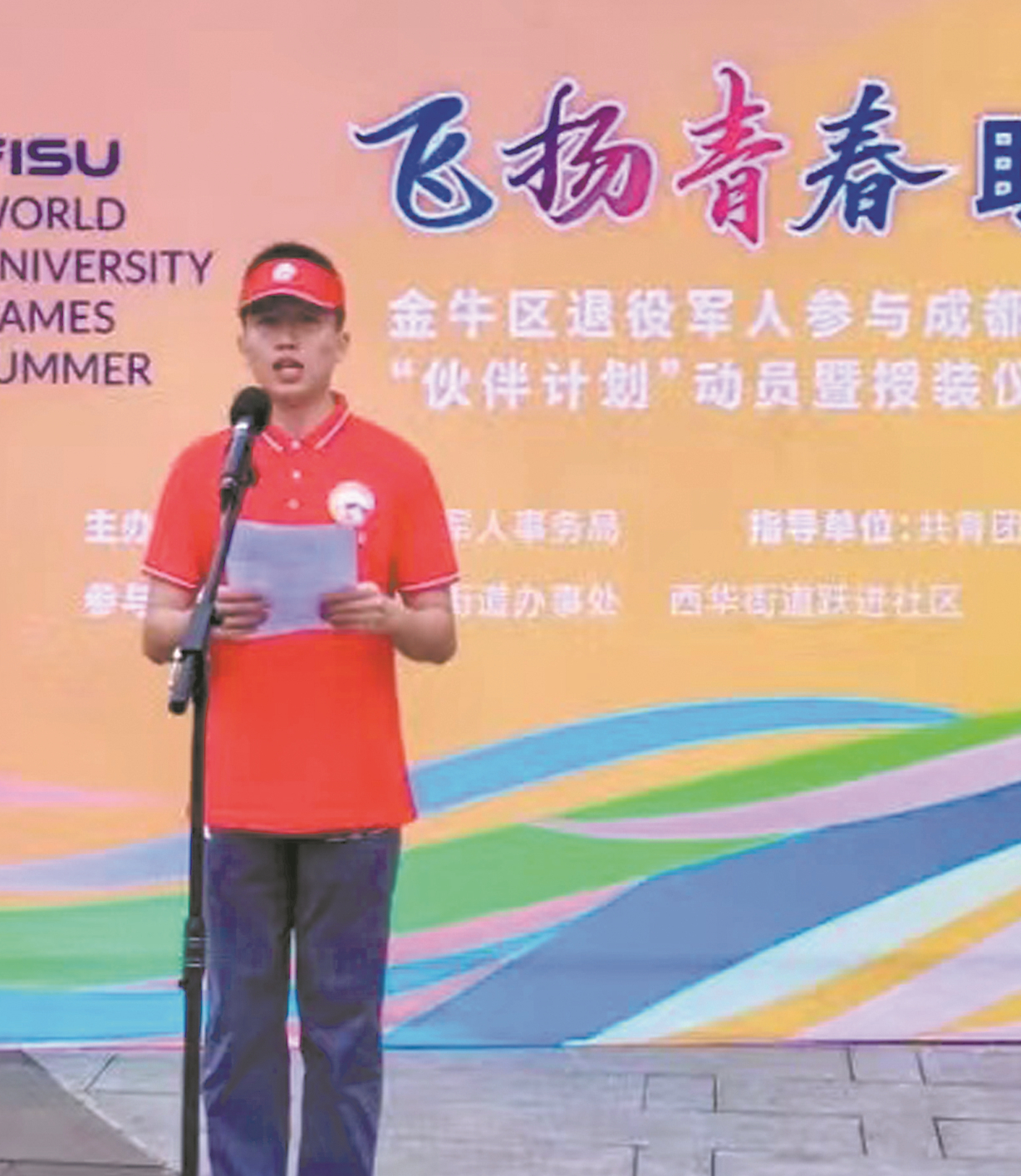退役大学生士兵志愿者在成都大运会志愿服务“伙伴计划”动员会上发言。