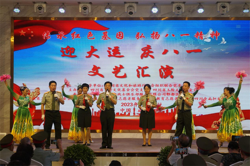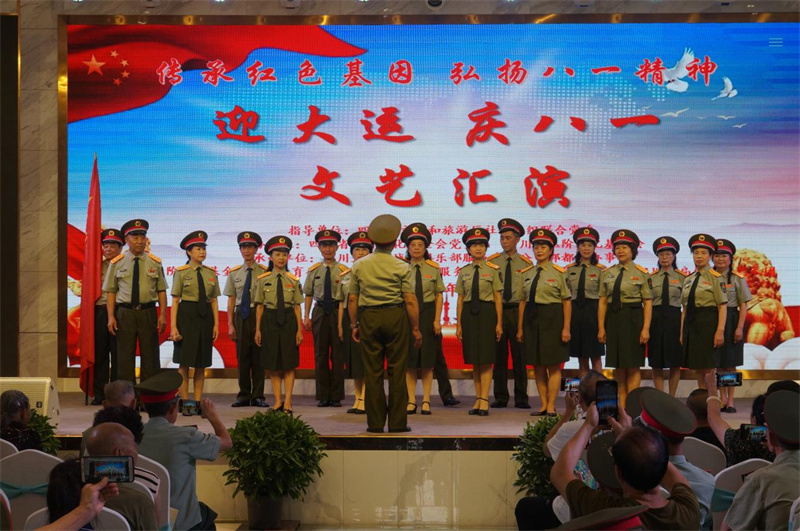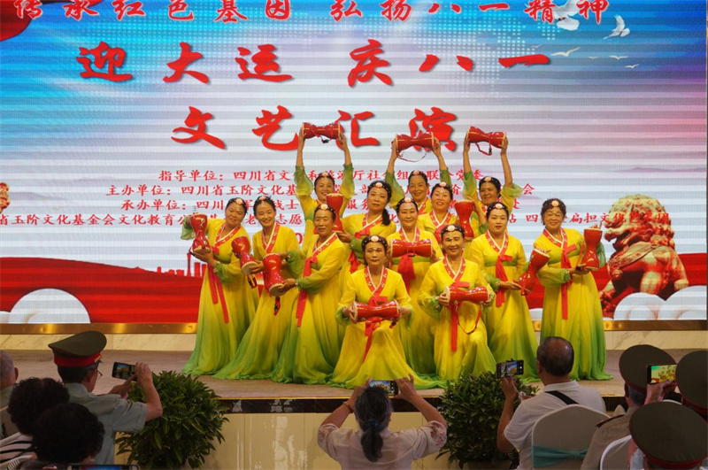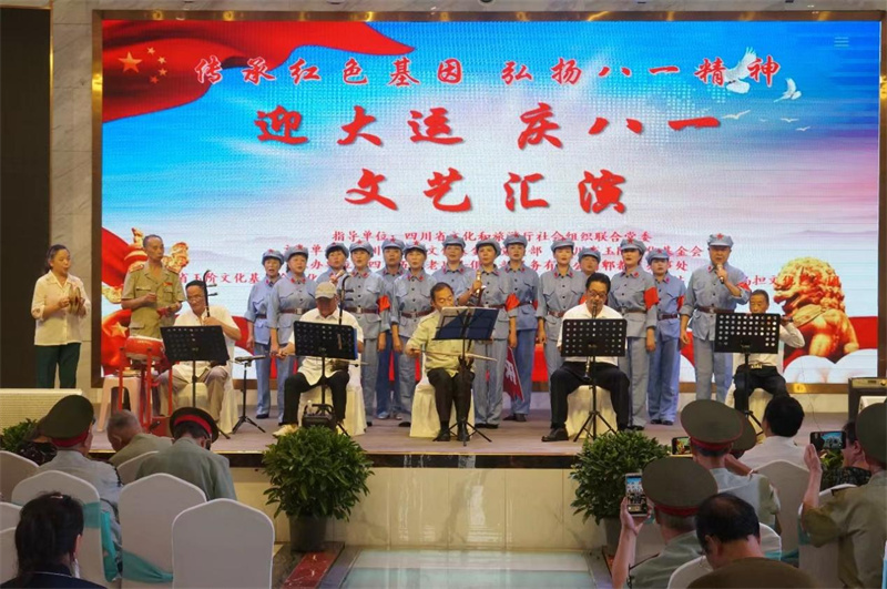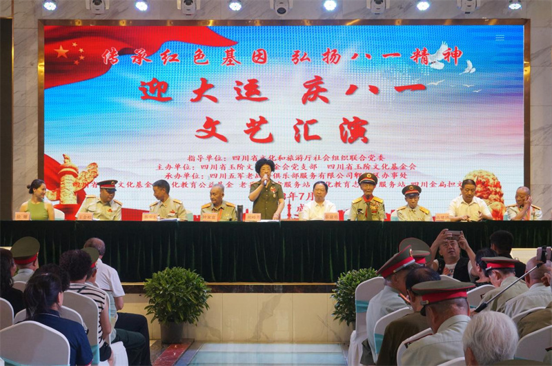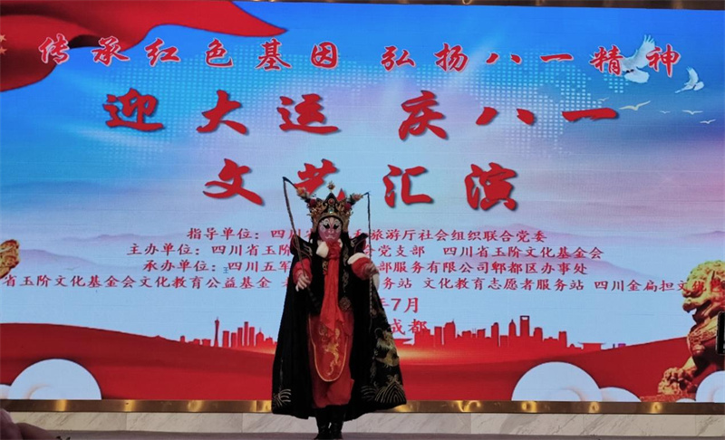 在第96个八一建军节来临、第31届世界大学生夏季运动会开幕之际,为牢记革命功臣,发扬光荣传统,加强爱国主义教育,传承红色基因、弘扬八一精神,喜迎大运会在蓉隆重开幕、推动“红星暖军行动”走深走实。7月27日,由四川省文化和旅游厅社会组织联合党委指导,四川省玉阶文化基金会党支部、四川省玉阶文化基金会主办,四川五军老战士俱乐部服务有限公司郫都区办事处,玉阶文化基金会文化教育公益基金、老兵志愿者服务站、文化教育志愿者服务站、四川金扁担文化艺术团等单位承办的“传承红色基因弘扬八一精神迎大运·庆八一”文艺汇演暨玉阶文化基金会志愿者服务站(成都片区)工作交流会在成都举行。