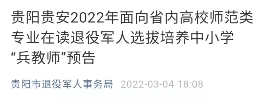 此前一天,定向培养中小学“兵教师”的试点工作发布公告,试点地区贵阳拟在退役军人中公开选拔小学、初中带编教师30名,其中文史类10名、理工类10名、体育教育10名。